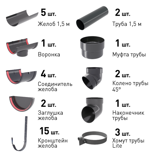Комплект ВС Гранд Лайн ПВХ Классика с металлическими кронштейнами для устройства водостока длиной до 7,5 м. по карнизу, высота — до 3 м. В комплекте: желоб 1500 мм – 5 шт.; воронка желоба – 1 шт.; соединитель желоба – 4 шт.; заглушка желоба – 2 шт.; кронштейн желоба подкровельный – 15 шт.; труба 1500 мм – 2 шт.; колено трубы 45° – 2 шт.; сливное колено — 1 шт.; муфта трубы – 1 шт.; хомут трубы универсальный – 3 шт.