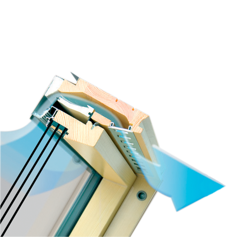 В конструкции мансардного окна FTS-V предусмотрено 3 контура уплотнения, что обеспечивает защиту от продувания и хорошую звукоизоляцию, комфорт при закрывании оконной створки. Удобная ручка, расположенная в нижней части оконной створки, позволяет легко открывать-закрывать мансардное окно и фиксировать его в двух положениях проветривания.