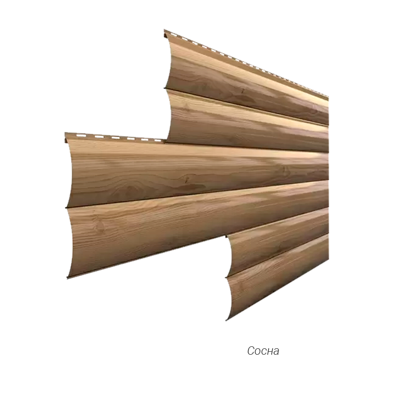 Вид профиля — Блокхаус. Покрытие — глянцевое, имитация натуральных материалов. Оно обеспечивает коррозионную стойкость, устойчивость к механическим повреждениям и ультрафиолету. Не выгорает.