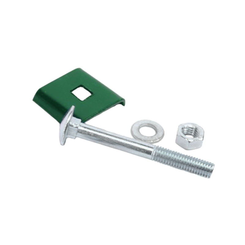 Универсальная оцинкованная скоба с отверстием, один из вариантов крепления сварной сетки к столбу или к другой опоре. Комплектуется болтом и гайкой M6. Загнутые края позволяют надежно зафиксировать сетку к каркасу ограждения. Применяется при монтаже со сверлением опорной конструкции. Скоба окрашена полимерно-порошковым способом в цвет RAL6005 Зеленый мох.