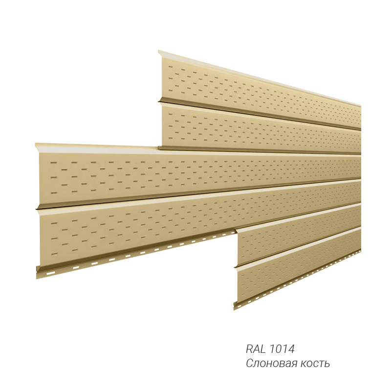 Металлический софит L-брус с полной перфорацией и глянцевым покрытием NormanMP от Металл Профиль, толщиной стали 0,5 мм. Перфорация на всех полосах позволяет повысить проходимость воздуха под кровлей. Длина панели софита позволяет резать софит нужного размера от 0,5 до 6 м. Софиты предназначены для декоративной отделки свесов кровли, фронтонов, потолков открытых террас, беседок, веранд, крылец. Софиты с перфорацией обеспечивают вентиляцию подкровельного пространства, отвод испарений, что препятствует развитию плесени и грибка в подкровельных помещениях. Применяются для подшивки выступающих элементов кровли: козырьков, карнизов, коньков, свесов. Софиты под брус Металл Профиль представлены в широкой палитре цветов и покрытий, и расширяют возможности создания оригинального внешнего вида строения. Глянцевое покрытие NormanMP толщиной 25 мкм на основе полиэстера обеспечивает коррозионную стойкость, не выцветает под воздействием солнечных лучей, не боится влаги и выдерживает термическое воздействие до +100°C. Преимущества металлических софитов: — Пожароустойчивы — Высокая устойчивость к деформациям — Выдерживают существенные перепады температур — Большой выбор цветов и покрытий — Длительный срок службы, Купить металлический перфорированный софит под брус с покрытием NormanMP от Металл Профиль по приятной цене вы можете в нашем интернет-магазине Удачная покупка. Наши менеджеры рассчитают необходимое количество материала и помогут с выбором комплектующих.